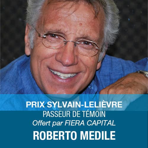 Le chanteur, comédien et producteur, Roberto Medile, a remporté le prix Sylvain-Lelièvre de la Fondation SPACQ pour le Passeur de témoin. La récompense a été remise à M. Medile par M. Rodrigue Lussier de Fiera Capital, commanditaire du prix. Ami de longue date de Sylvain Lelièvre, Roberto Medile a chanté de nombreuses pièces tirées du répertoire du poète de Limoilou. Il a également eu le privilège d’interpréter des chansons originales composées uniquement pour lui, dont Ce n’est qu’une chanson madame. Parmi les classiques de Sylvain Lelièvre que Roberto Medile a adapté du français à l’italien figurent Petit matin, J’ai perdu trop de temps, La valse du bonheur et Le plus beau métier. C’est d’ailleurs avec le dernier vers de cette dernière que M. Medile a terminé son mot de remerciement : «Y a pas plus beau métier que celui de chanter».
